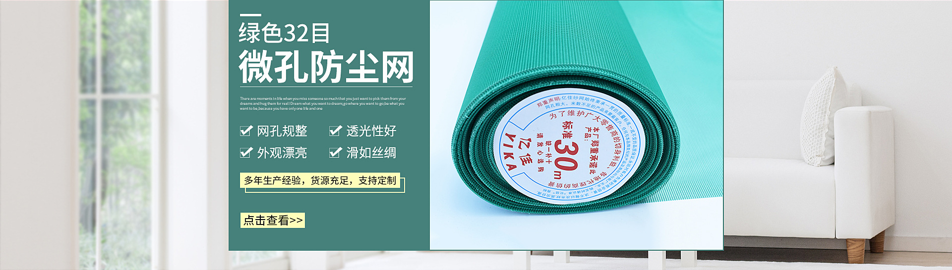 菏澤恒天然窗飾材料科技股份有限公司一是家大型股份制窗飾材料生產(chǎn)廠(chǎng)家。公司位于中國(guó)山東菏澤單縣經(jīng)濟(jì)開(kāi)發(fā)區(qū)。我公司擁有現(xiàn)代化的生產(chǎn)設(shè)備和自主研發(fā)團(tuán)隊(duì)。開(kāi)發(fā)出了高分子復(fù)合隱形窗紗產(chǎn)品,出口到30多個(gè)地區(qū),是原有窗紗網(wǎng)的理想升級(jí)換代產(chǎn)品。 我公司的主要產(chǎn)品有,窗紗類(lèi):高分子隱形窗紗,32目微孔防塵網(wǎng),聚酯化纖窗紗,折疊窗紗等;窗簾類(lèi):遮光簾,柔紗簾,卷簾,半透光簾。還有紗窗和窗簾成品等,我們將以良好的產(chǎn)品質(zhì)量,共贏(yíng)的商業(yè)理念期待與您的合作!